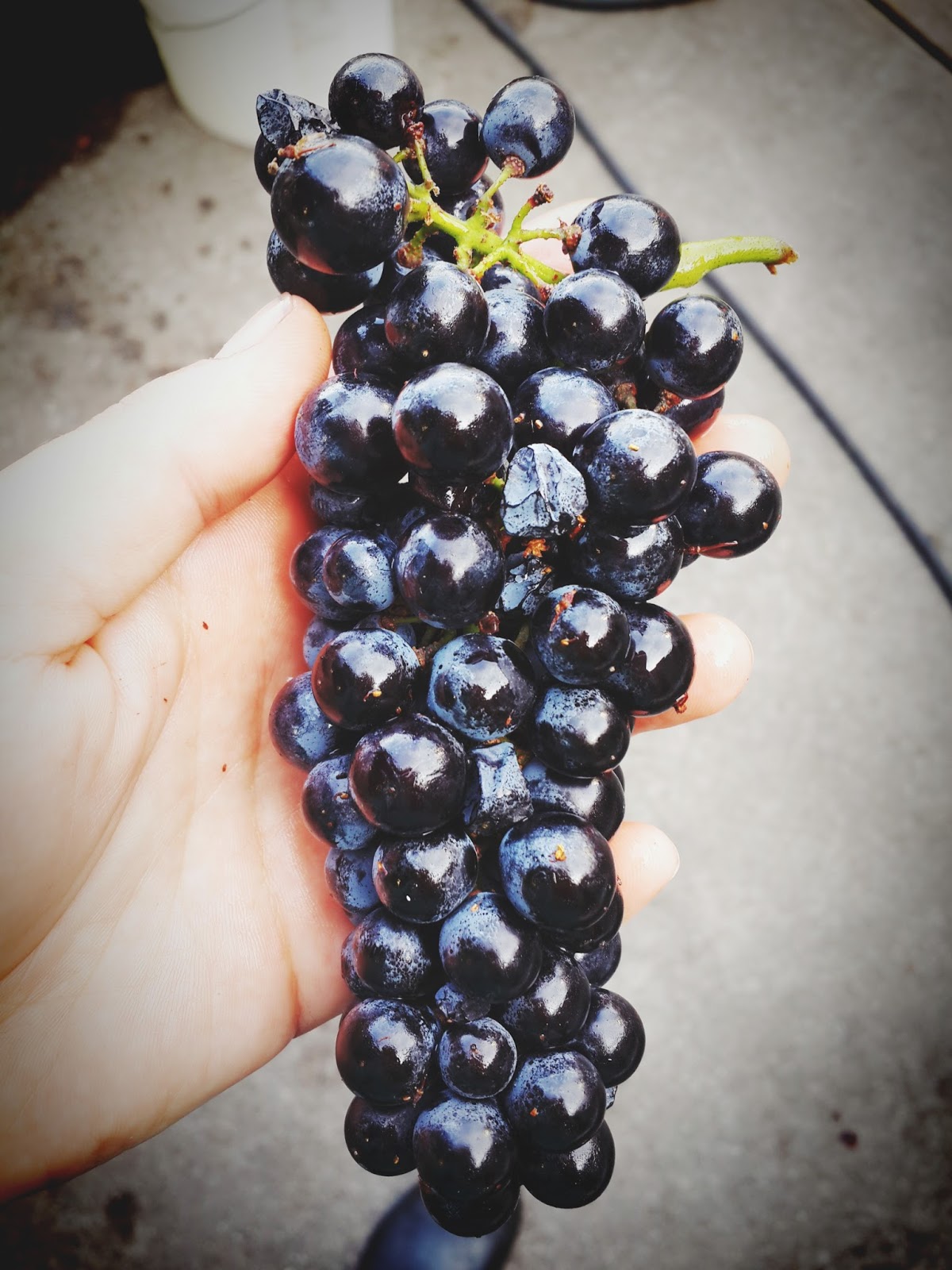 This cluster may look pretty, but the berries are extremely tart and hard! Some 2nd crop 'late ripening grapes' we want to pull these clusters out. Some clusters aren't as easy to spot such as this one, so one must pay close attention and feel the clusters to make sure they are soft, which is also a good indicator of ripeness.